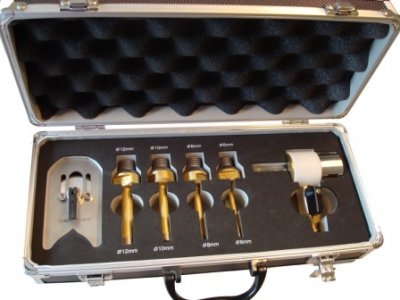 Im Set je 1xDiamant-Bohrkronen 6mm, 8mm, 10mm, 12mm mit NL=70mm + 1xSpühlkopf 1/2" auf 6-kant + 1xEdelstahl Anbohrhilfe mit Saugfuß im praktischen Alu-Koffer.