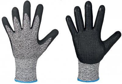 Feinstrickhandschuh mit Nitrilschaum-Innenhandbeschichtung und Nitrilnoppen.