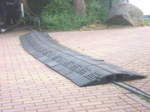 Die Verbindungselemente dienen gleichzeitig als Tragegriffe. Stabil, reißsicher, bruchbeständig und haftfest. Absoluter Schlauchschutz ist gewährleistet. Die Schlauchbrücke paßt sich Unebenheiten an und läßt sich beliebig bis zur gewünschten Breite aneinanderreihen. Einsatzbereich überall dort, wo freiliegende Schlauch- bzw. Rohrleitungen überquert werden müssen.