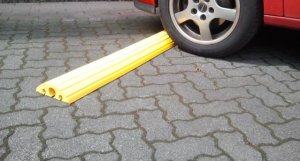 mit rutschhemmend profilierter Unterseite, erlaubt einfachstes und sicheres Verlegen von Kabeln, Schläuchen und Rohrleitungen. Einsatzbereiche finden sich überall dort, wo freiliegende Kabel-, Schlauch- oder Rohrleitungen überquert werden müssen.