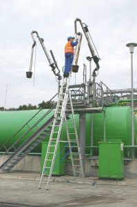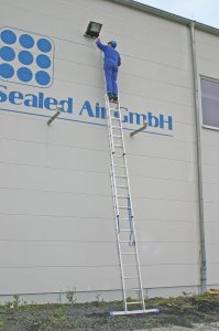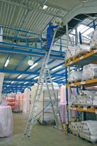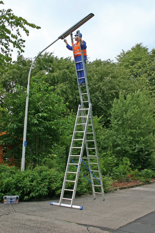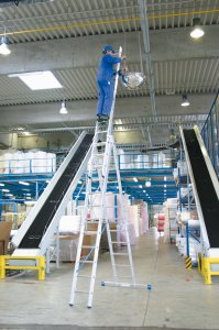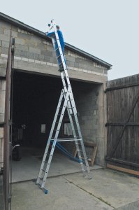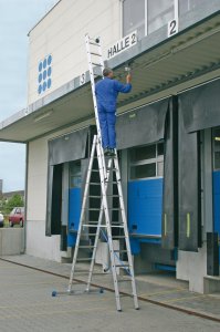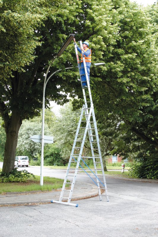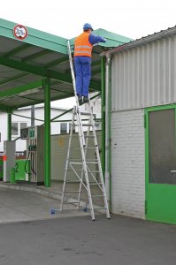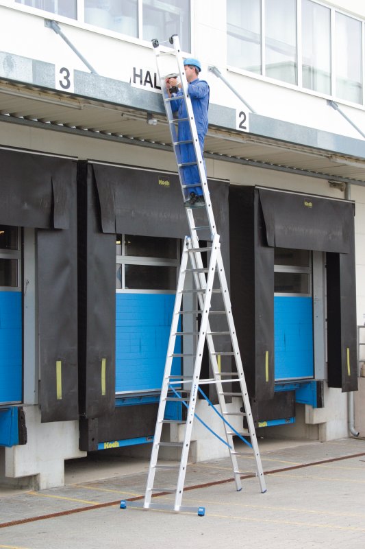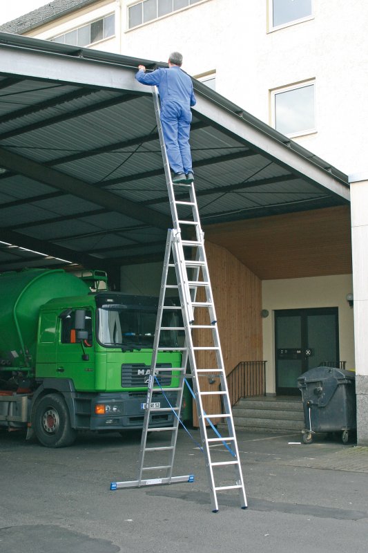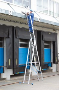 Dreiteilige Aluminium-Vielzweckleiter, einsetzbar als Anlege-, Schiebe- und Stehleiter mit ausschiebbarem Leiternteil.